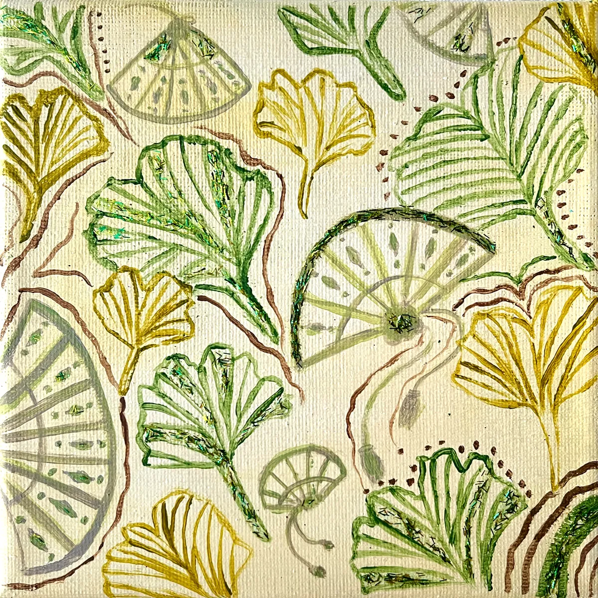 Glitter Acrylic Japanese Pattern Painting. This painting is from the series named Japanese Patterns. This unique painting combines the timeless beauty of the Japanese fan, symbolizing prosperity and the graceful unfolding of life's moments, with the resilient Ginkgo leaf, a testament to endurance and hope. 🖌️ This 100% original work invites you to connect deeply with your own journey, reminding you to find beauty and grace in every chapter. Bring home this serene and refined piece, and let it inspire you daily with its enduring wisdom and elegance. ✨ Own a story of resilience and grace.✨ This small square canvas is perfect for creating a serene and elegant atmosphere in any space. Its compact size makes it versatile for display: Pair it with other paintings to create a harmonious gallery wall. Place it on a small easel atop a table for a striking standalone piece. Integrate it into your existing decor for a touch of Japanese elegance.