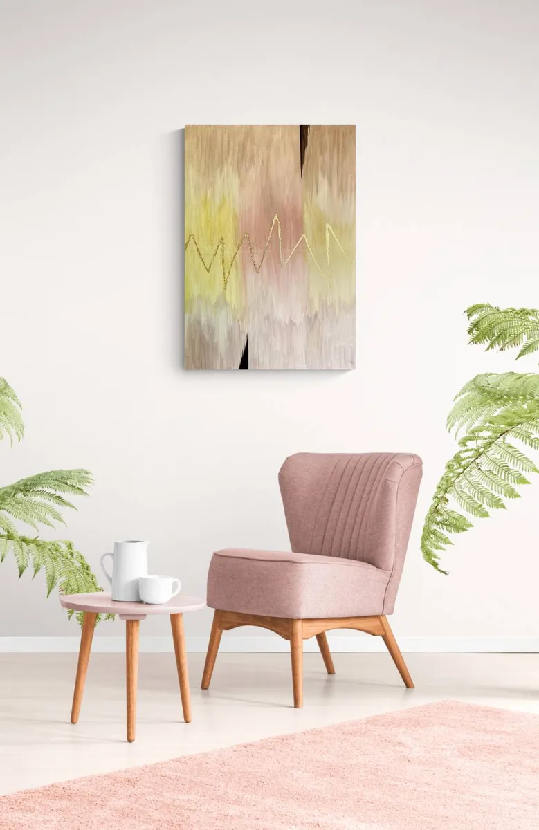 The artist made this painting when she was thinking of her mother and her love towards her. The heartbeat is pure like gold and pink colors represent a mother’s love.
