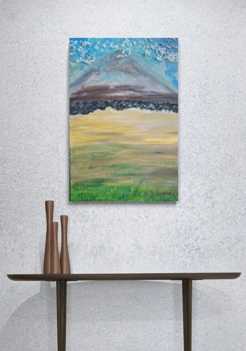 A meaningful landscape inspired by the beautiful sceneries of Fujairah, where the artist made joyful memories which she wished for a long time. It is made using acrylic paints, cotton and soft pastel.