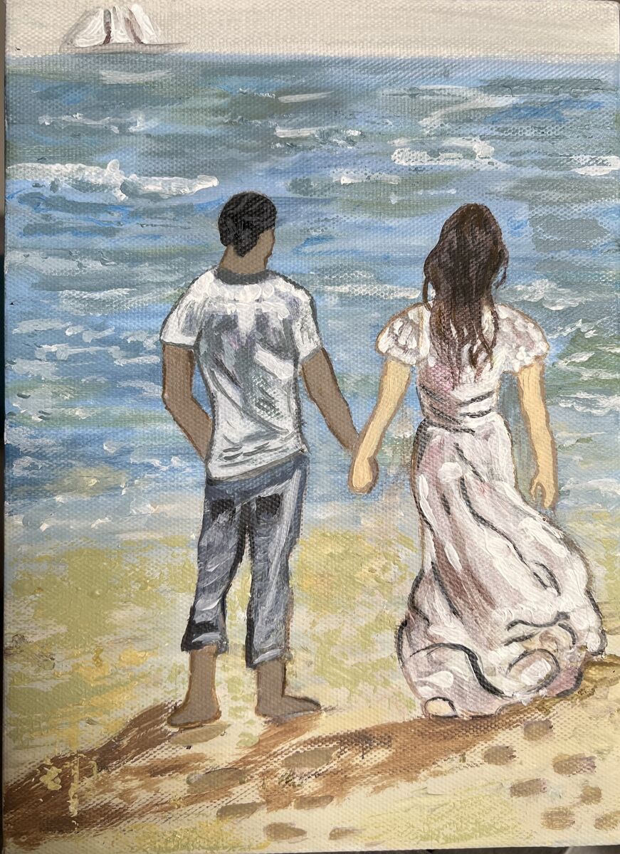An original painting of a couple by the beach holding hands to show love, hope and future together.
